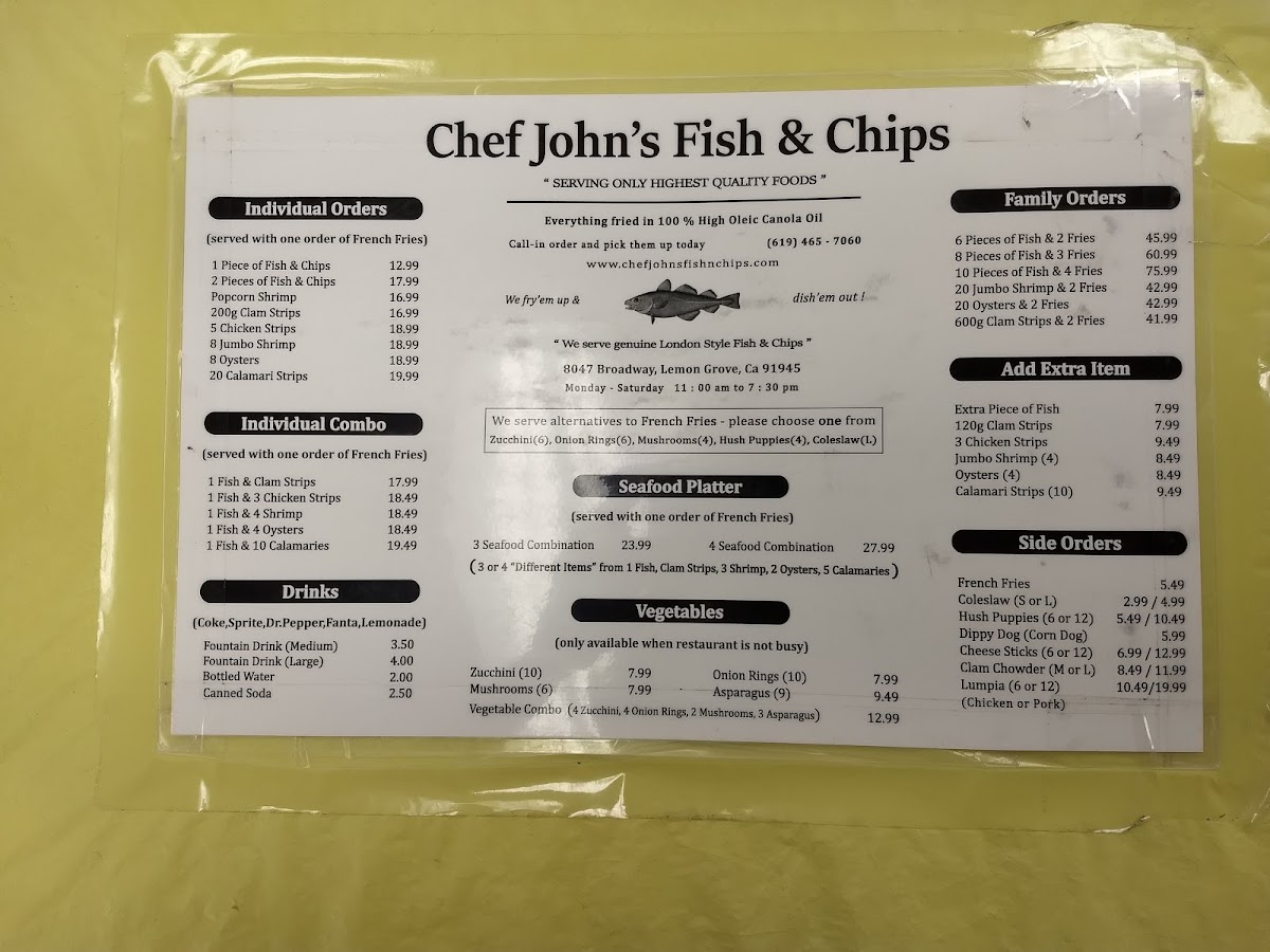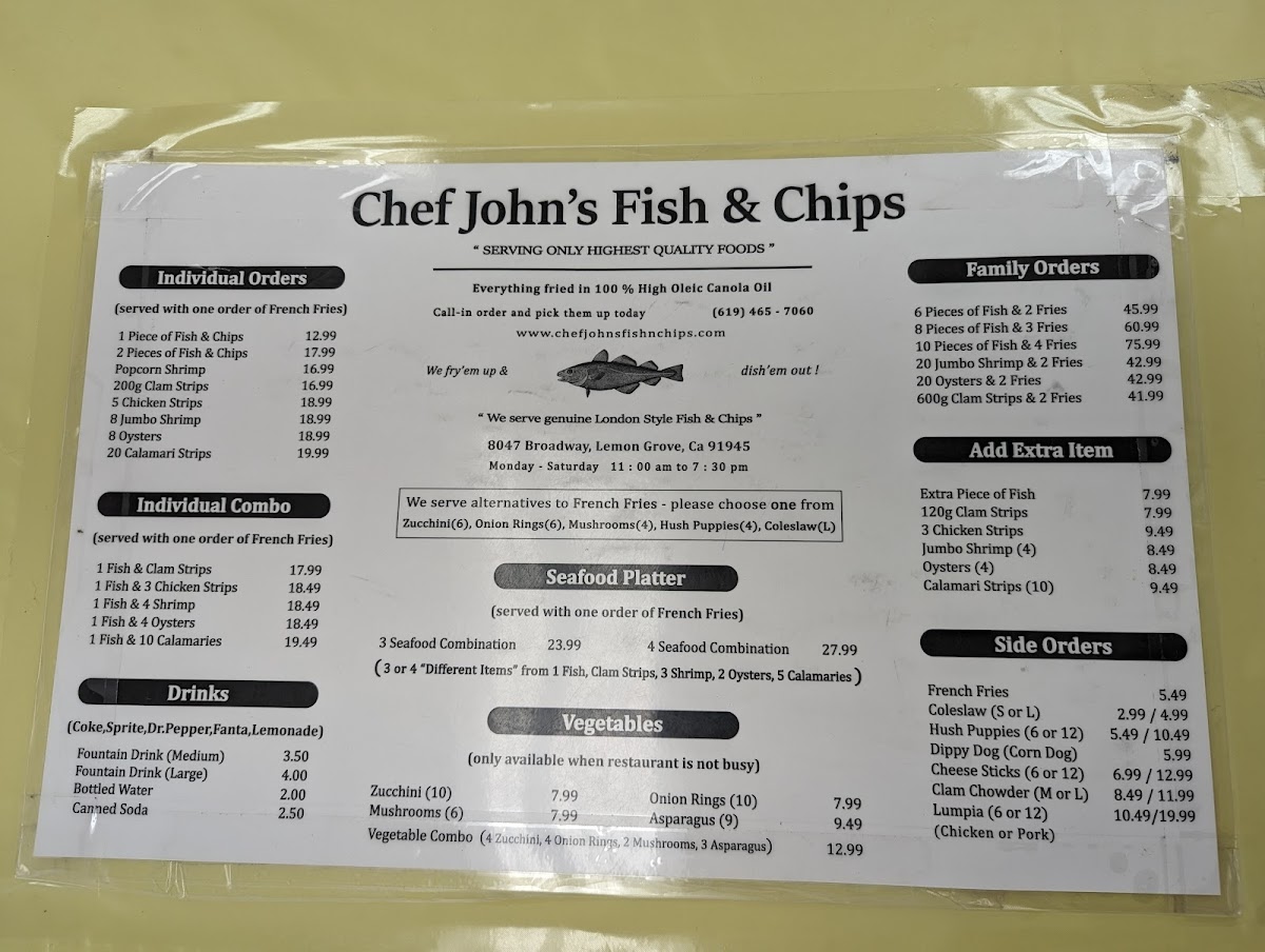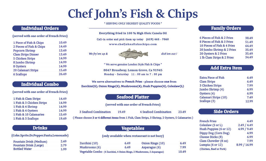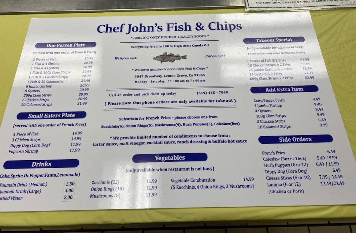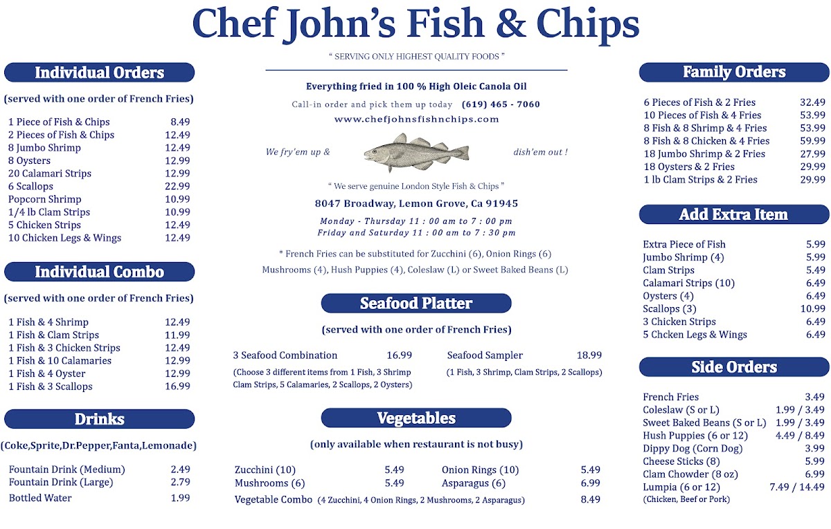 Chef John's Fish & Chips offers a straightforward menu that focuses on classic, comforting seafood dishes served in a casual setting. The menu features freshly made fish and chips, often accompanied by traditional sides like cole slaw, tartar sauce, and crispy hush puppies. Options include both individual plates and family-sized portions, making it easy to enjoy a quick lunch, a relaxed dinner, or a shared meal with friends and family.