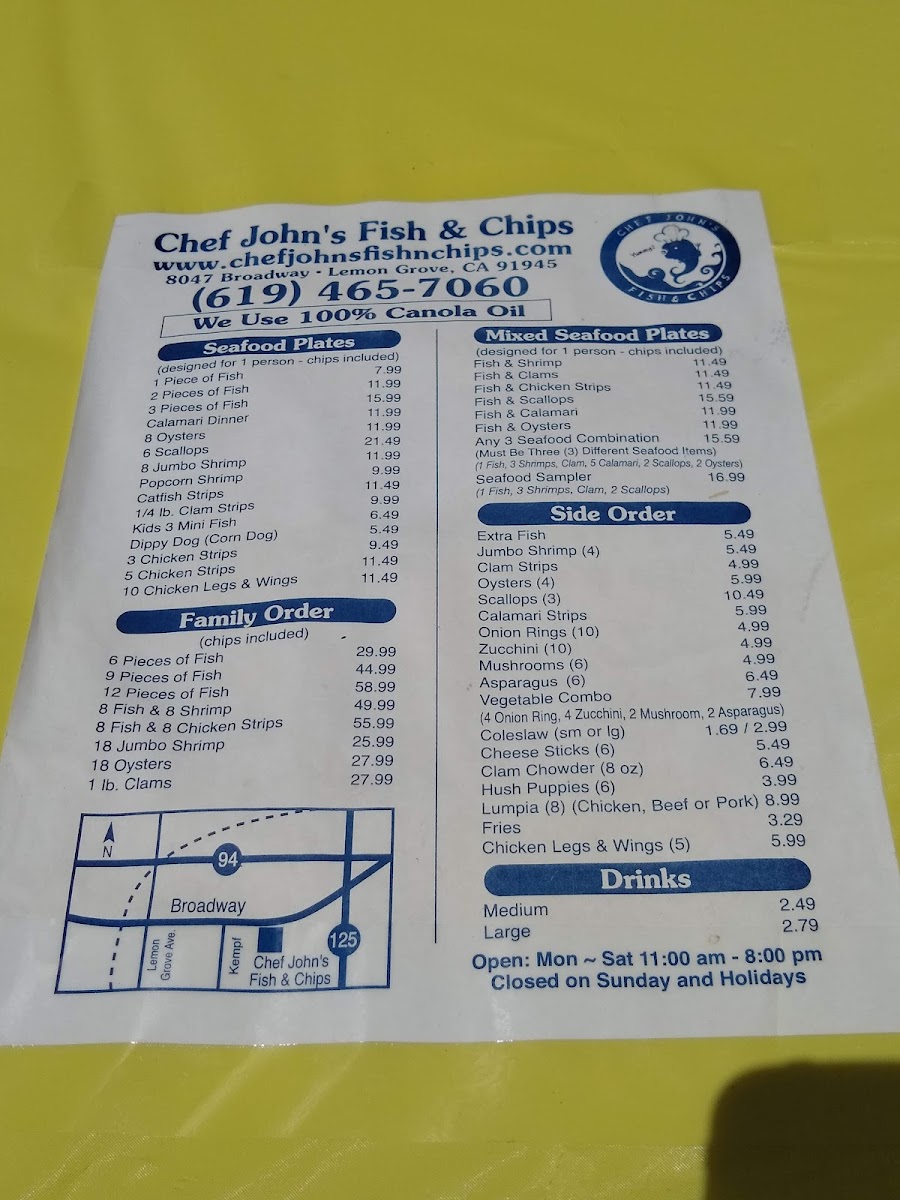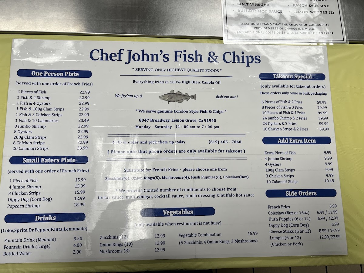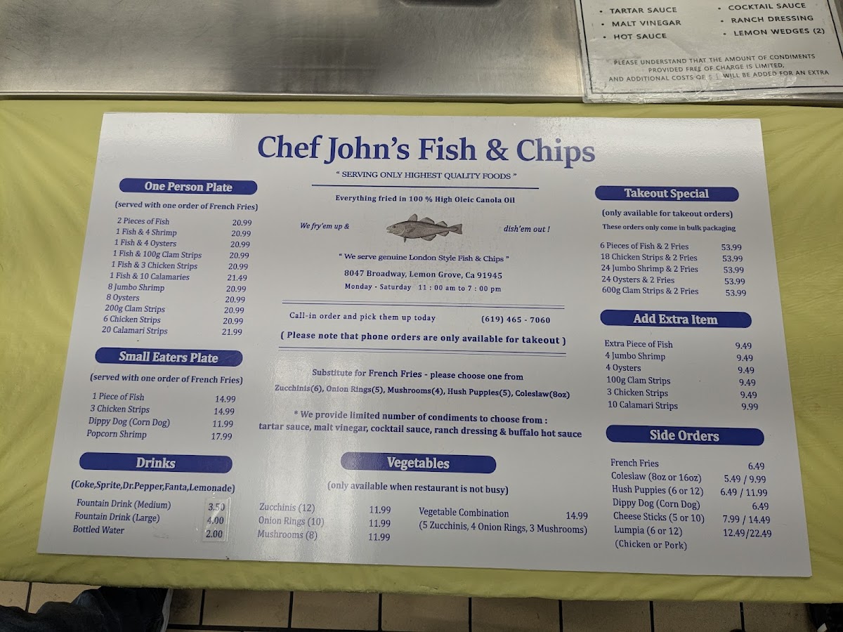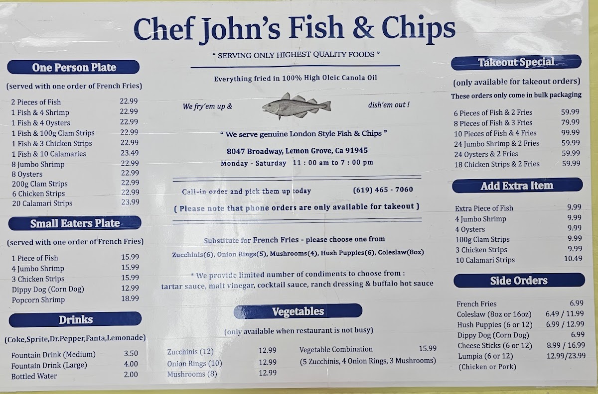 Chef John's Fish & Chips offers a straightforward menu that focuses on classic, comforting seafood dishes served in a casual setting. The menu features freshly made fish and chips, often accompanied by traditional sides like cole slaw, tartar sauce, and crispy hush puppies. Options include both individual plates and family-sized portions, making it easy to enjoy a quick lunch, a relaxed dinner, or a shared meal with friends and family.
